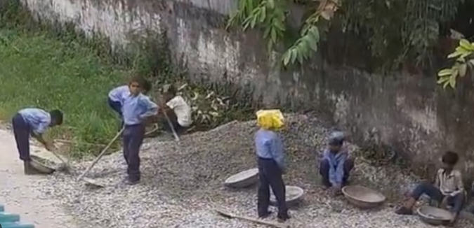 सरकारी स्कूल में बच्चों से उठवाए जा रहे हैं बजरी और सीमेंट, वीडियो हुआ वायरल