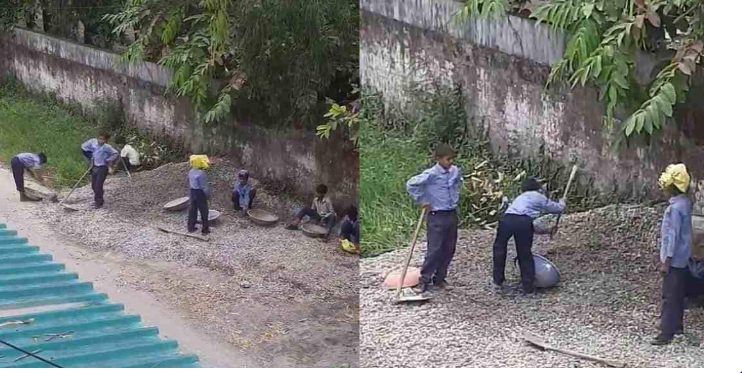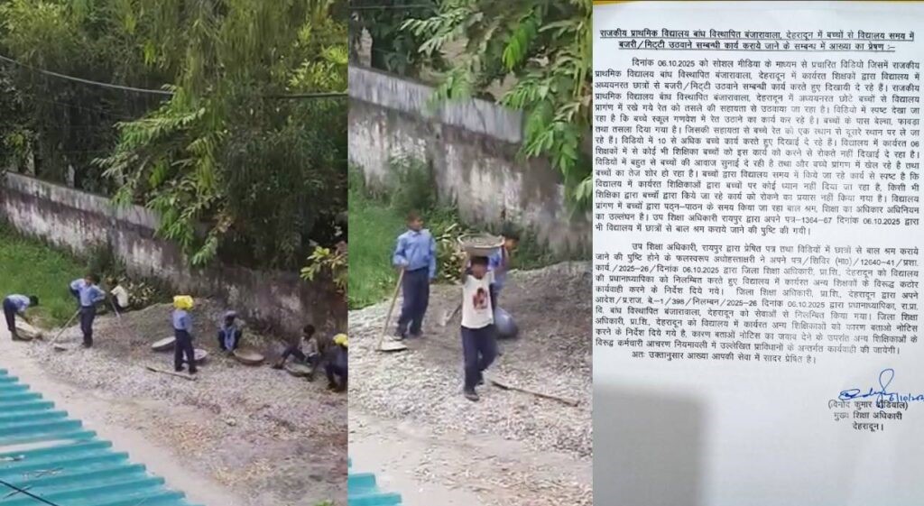 ये वीडियो बंजारावाला स्थित एक राजकीय प्राथमिक विद्यालय टी स्टेट का है।यह वीडियो सोमवार दोपहर का बताया जा रहा है। वीडियो में स्कूल के आठ बच्चे दिखाई दे रहे, जो बजरी से भरे तसले सिर पर उठाकर स्कूल की ओर जाते दिख रहे हैं।